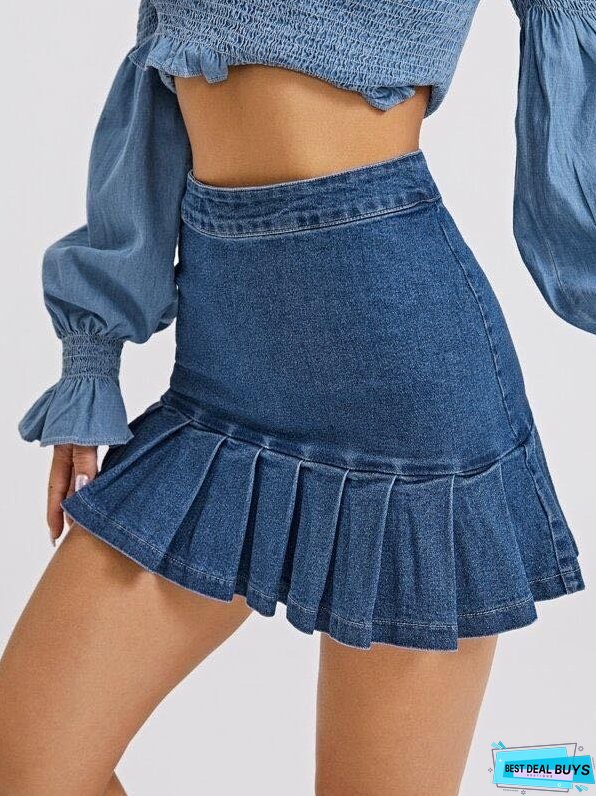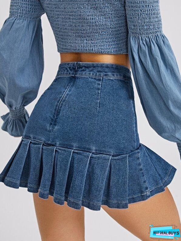 Zip Back Pleated Ruffle Hem Denim Skirt