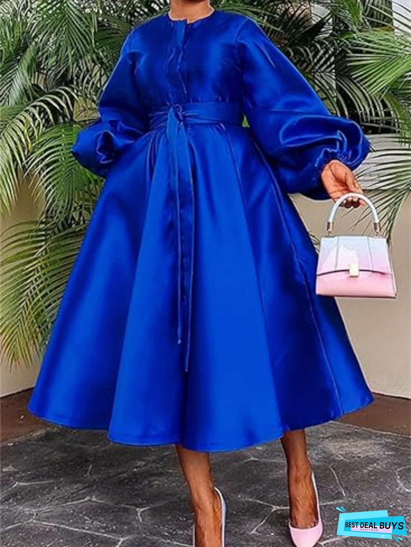Women's Elegant Glossy Satin A-Line Floor-Length Church Dress with Pockets - Long Sleeve Lantern Sleeve Round Neck Slim-Fit Extra-Long Formal & Semi-Formal Dress for Weddings, Easter, Christmas - Vibrant Pink or Solid Colors Available, Machine Washable, Autumn Style, Fitted Silhouette, Structured Design, Suitable for Spring/Autumn, Adult Women's Fashion, Church & Formal Events, Occasion Dresses for Women, Fall Wedding Guest Dresses, Wedding Dresses for Women Elegant Classy,