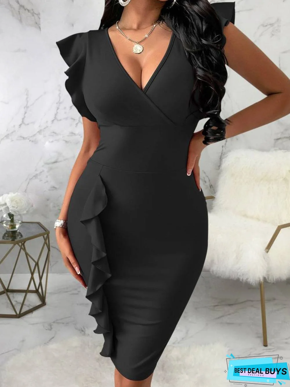 Features: Deep V-neck, solid color, ruffle sleeves, bodycon, sexy pencil midi dresses.