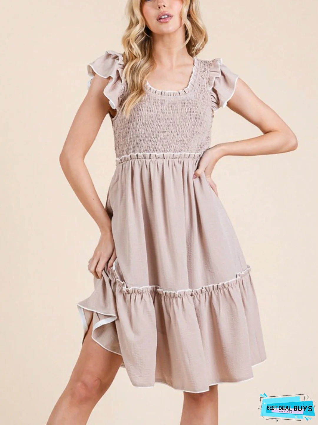 Womens Casual Summer Midi Dress Romantic Smocked Bodice Ruffle Flutter Sleeve A Line Flowing Beige Knee Length Square Neck Tiered Skirt Fit And Flare Design Perfect For Beach Vacation Daily Wear Party