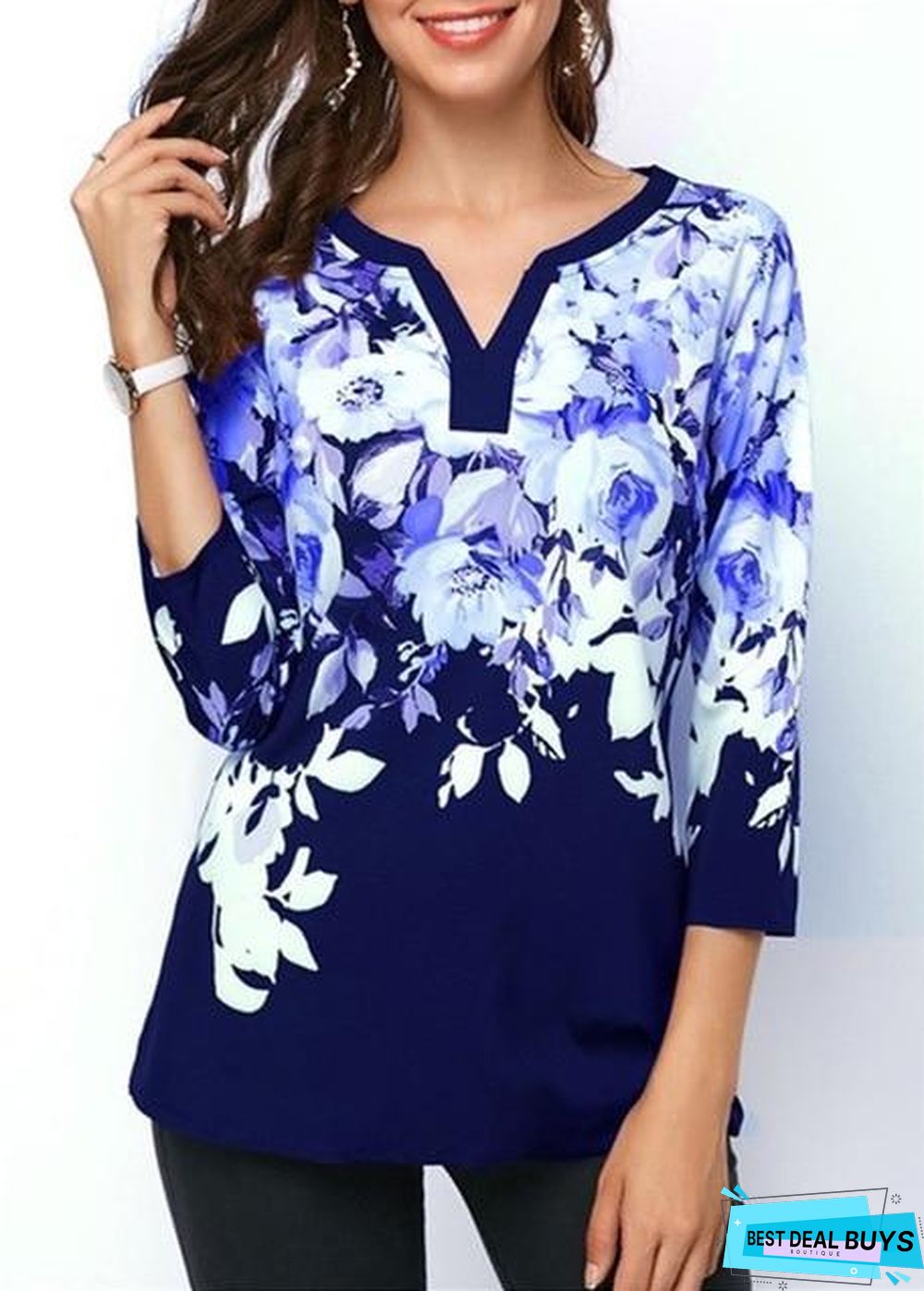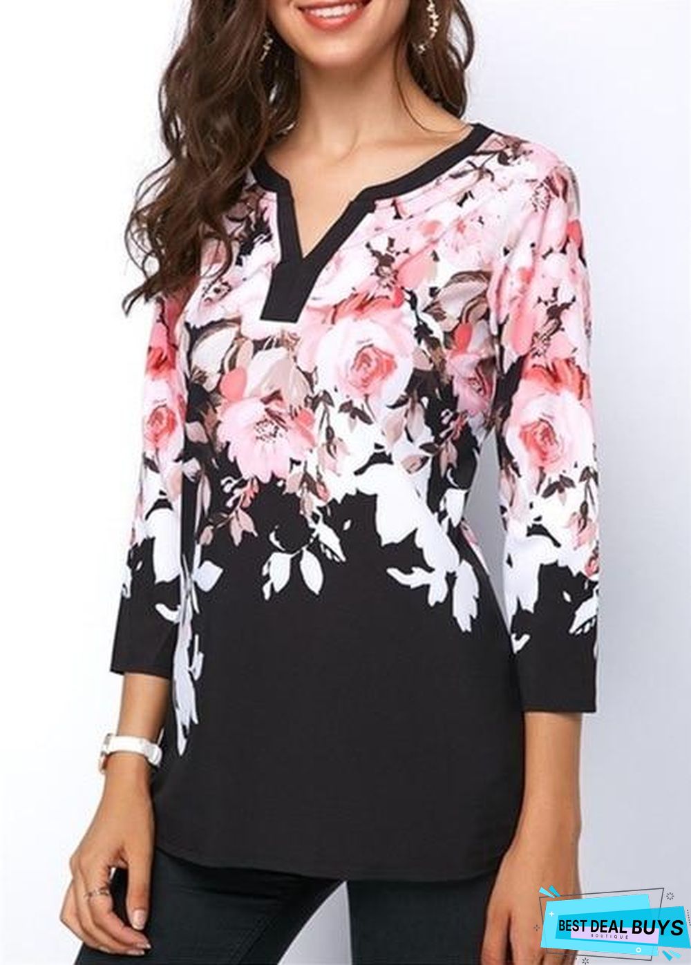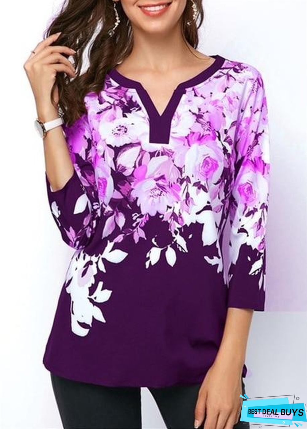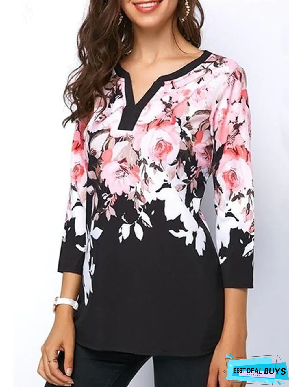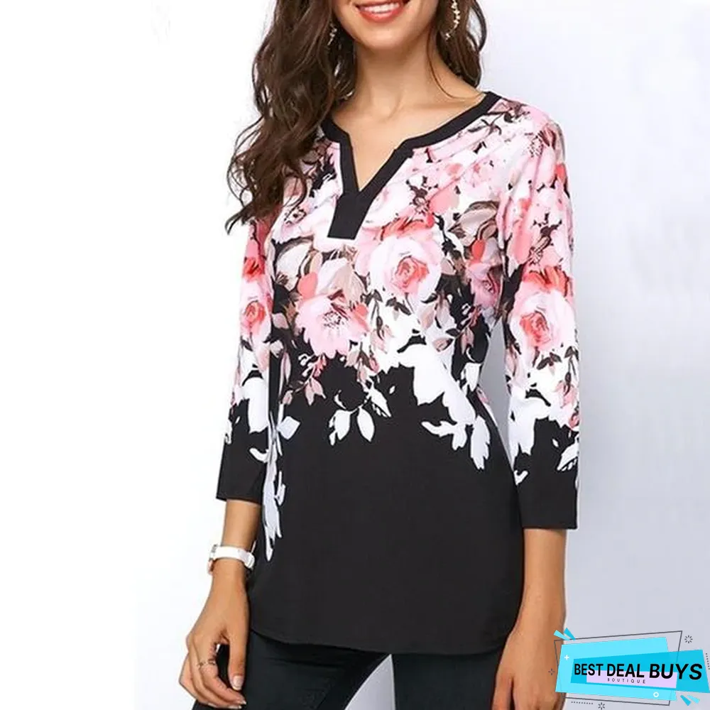 Plus Size Women Floral Printed Tops Three-Quarter Sleeve V-Neck T-Shirt