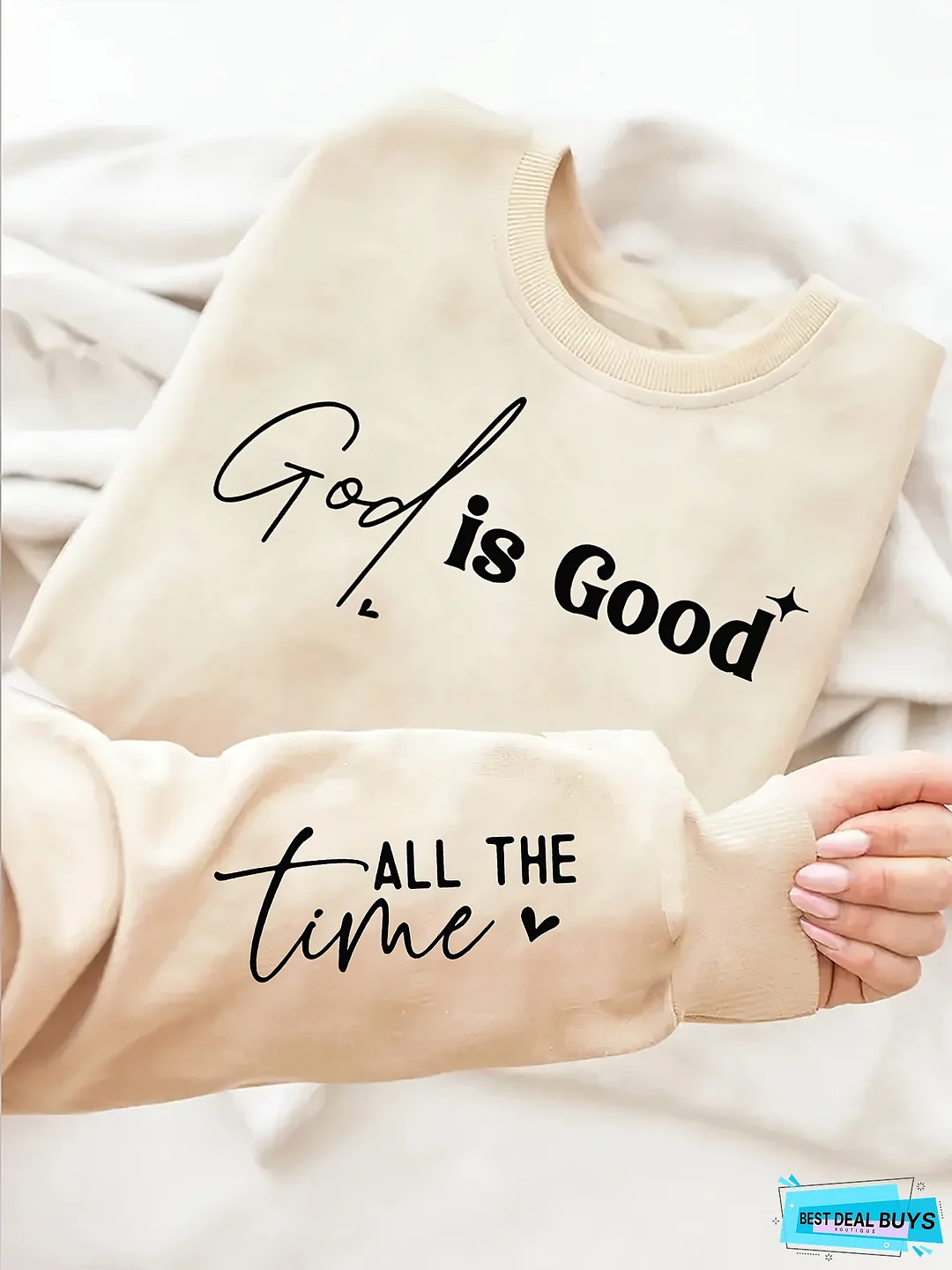 Plus Size Women's Oversized "God is Good" Letter Print Sweatshirt - Soft Pink Round Neck Casual Pullover, Cozy Fall Winter Clothing, Machine Washable, Winter Pullover, Graphic Pullover, Relaxed Fit