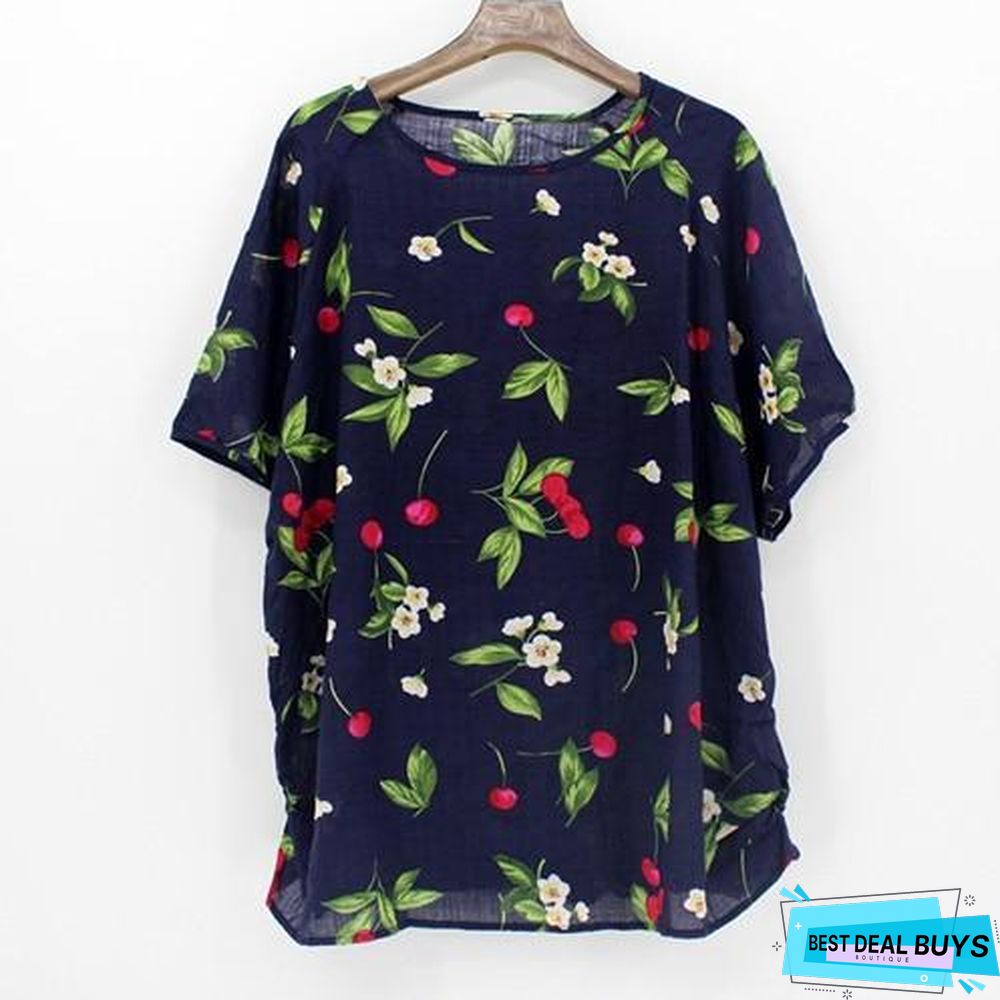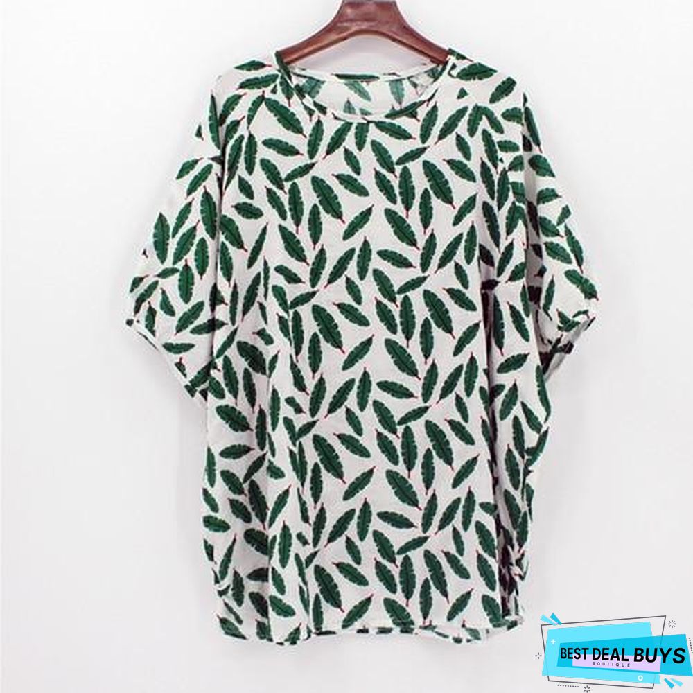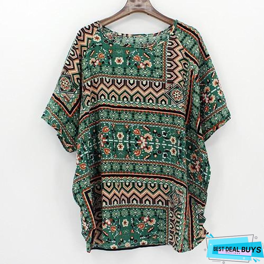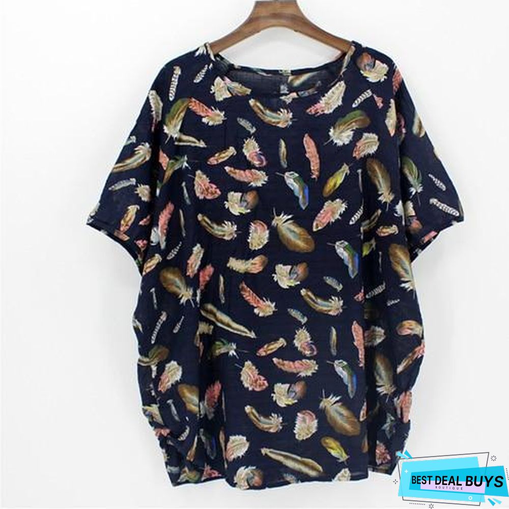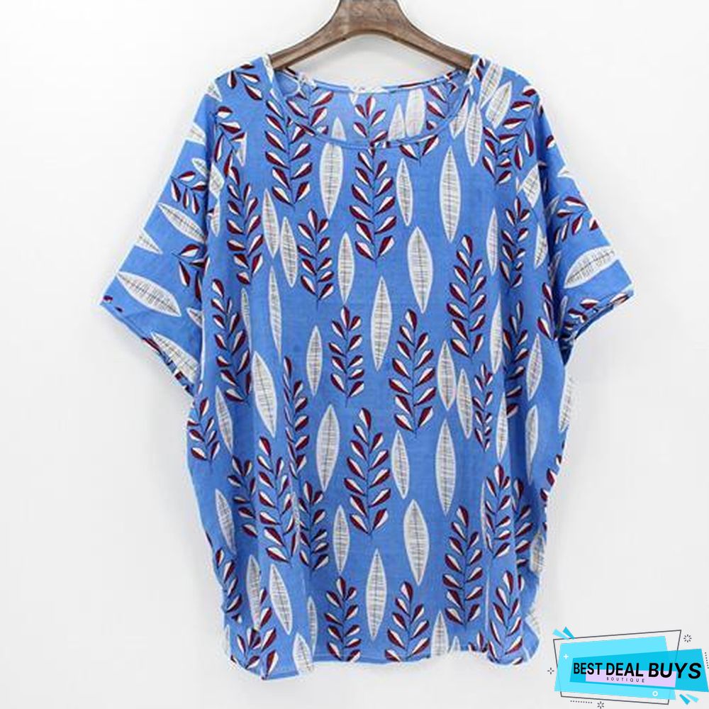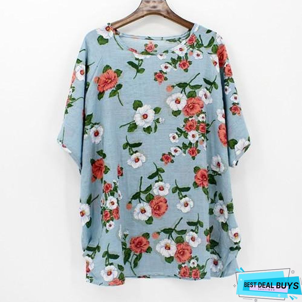 Plus Size Women Batwing Casual Tops Tees Floral Print Cotton Linen Blouses