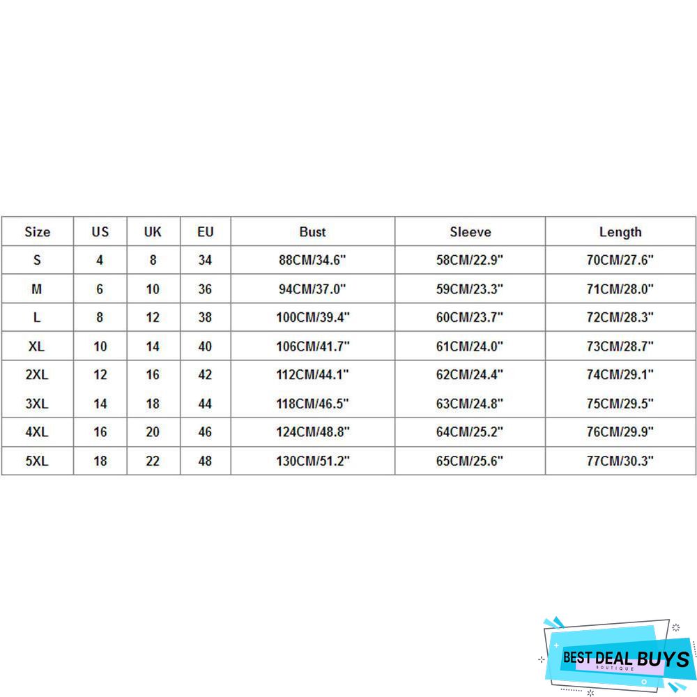 | Size | US | UK | EU | Bust | Sleeve | Length |