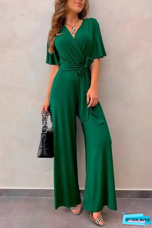 Black Short Sleeves V-neck Jumpsuit.
