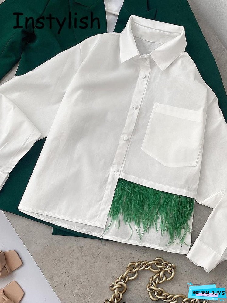 Back to school Casual Long Sleeve Feather Patchwork White Shirt Women Spring Button Up Lapel Chic Blouse Streetwear Simple Crop Top Oversized