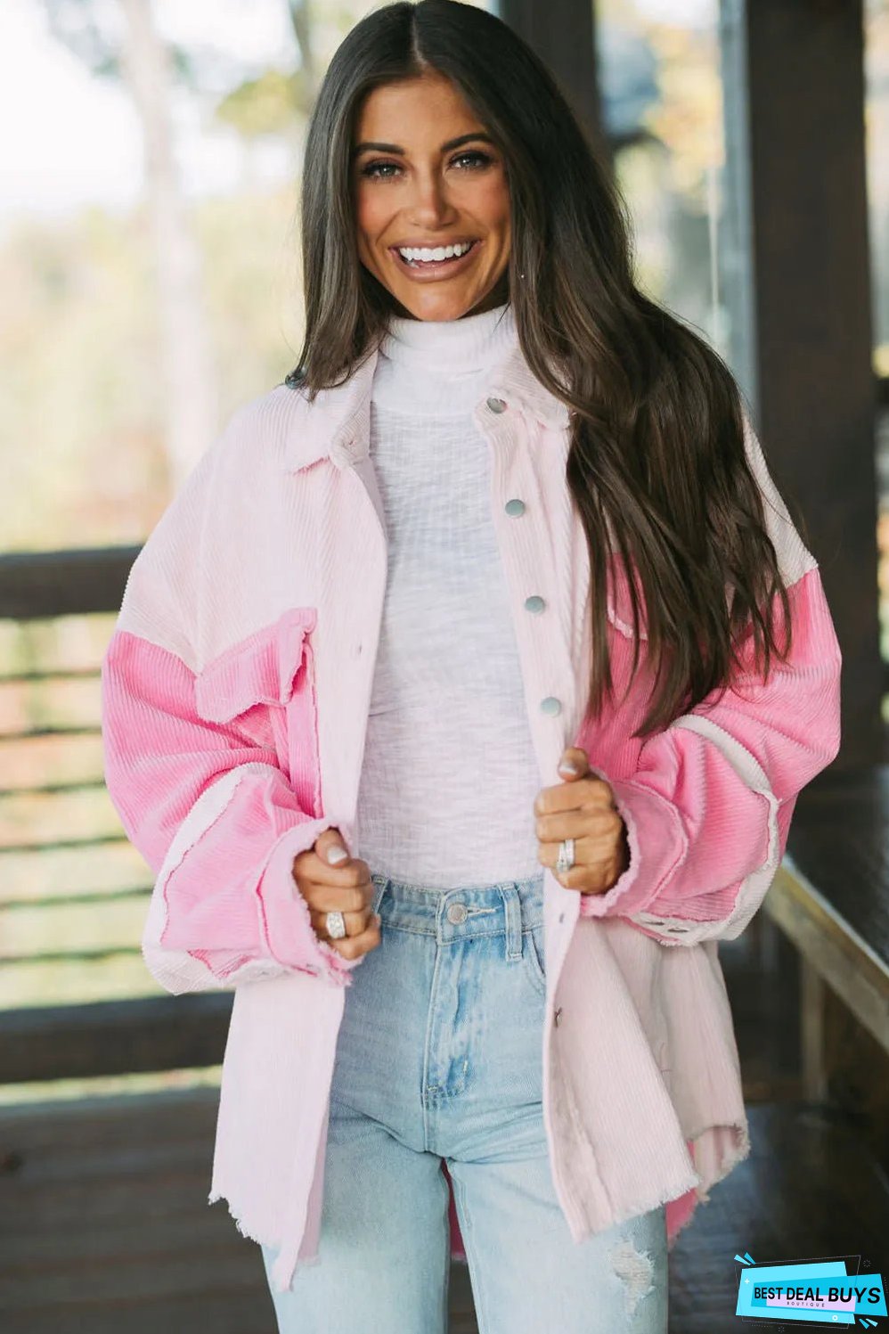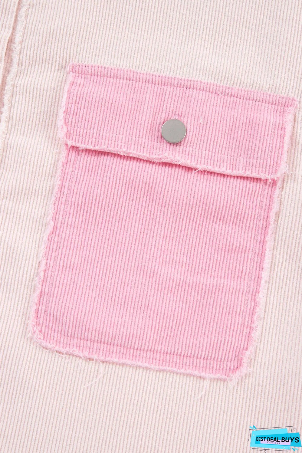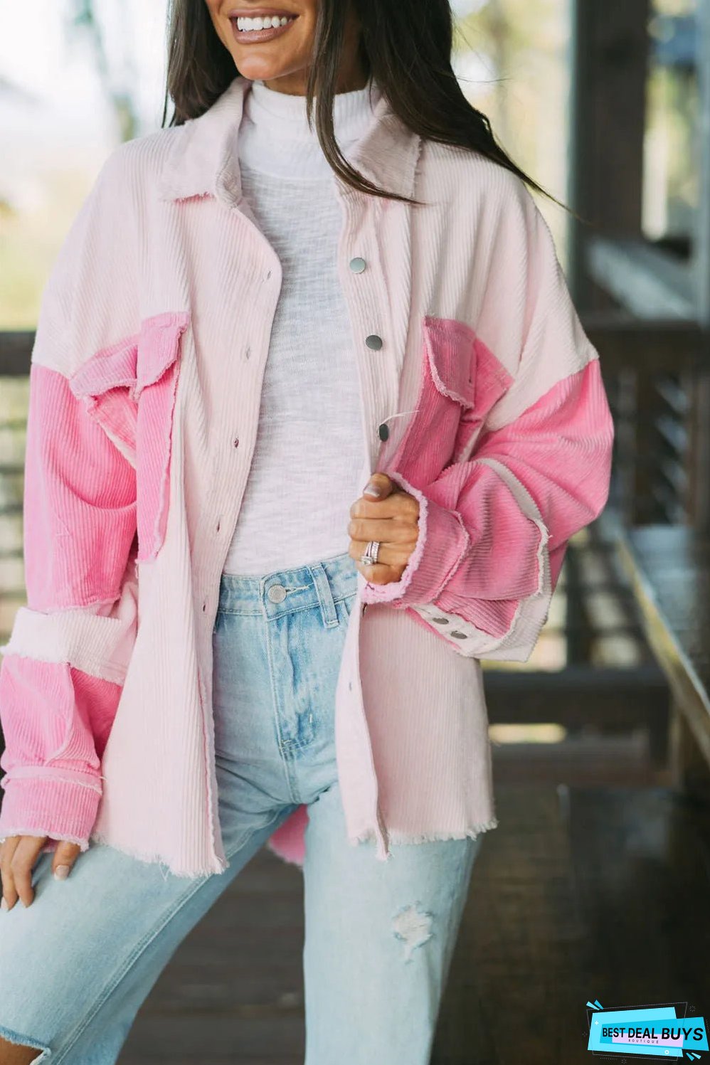 Two-tone color blocking adds a modern twist to this corduroy shacket.