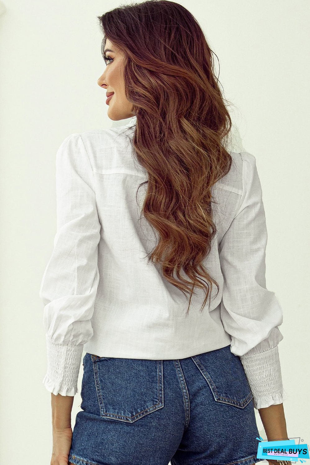 This shirt features a floral embroidered design and is made of pure cotton for comfort and health benefits. It has a frilled collar, shirred sleeves, and a buttoned front, and can be paired with jeans or suit trousers. Chic and elegant style.