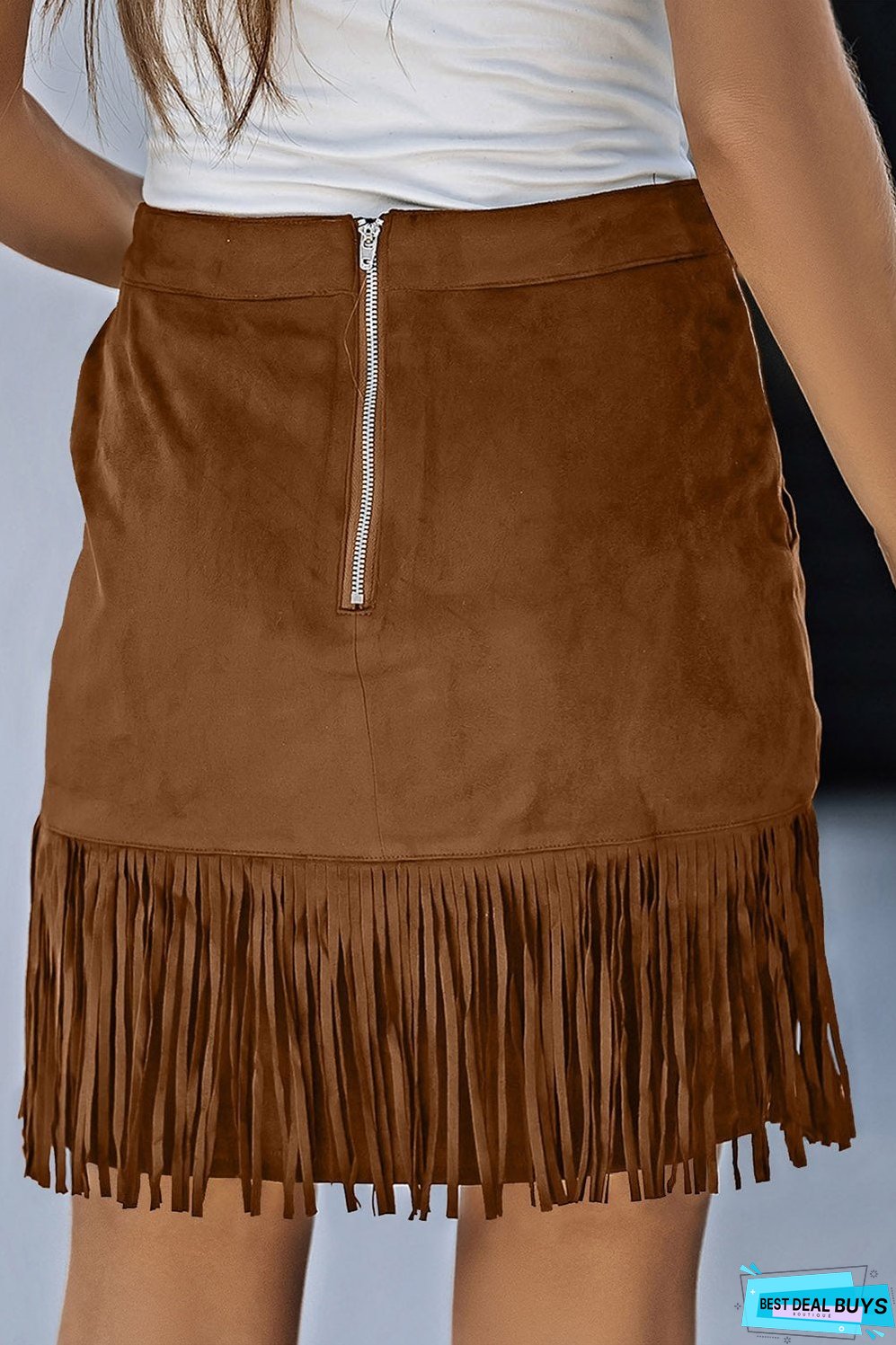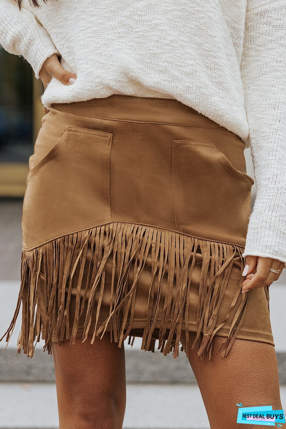 Elevate your wardrobe with our Fringe Detail Zip-Back Skirt with Pockets! This sleek skirt features eye-catching fringe detailing and a convenient zip-back closure. With the added bonus of pockets. you'll have both style and functionality at your fingertips. Upgrade your look and make a statement in this must-have skirt.