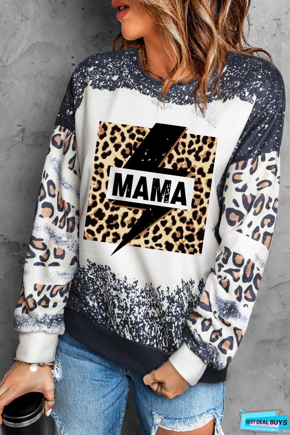 Stay stylish and cozy with our MAMA Lightning Graphic Leopard Sweatshirt. Designed specifically for women. this sweatshirt is the perfect addition to your wardrobe. Get ready to make a statement with our unique lightning graphic on a trendy leopard print. Perfect for casual days and lounging at home.