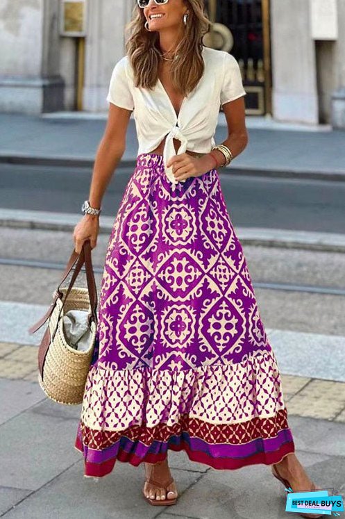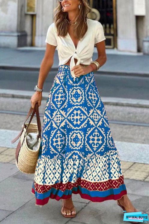 Meridress Bohemia Printed Elastic Waist Ruffle Maxi Swing Skirt