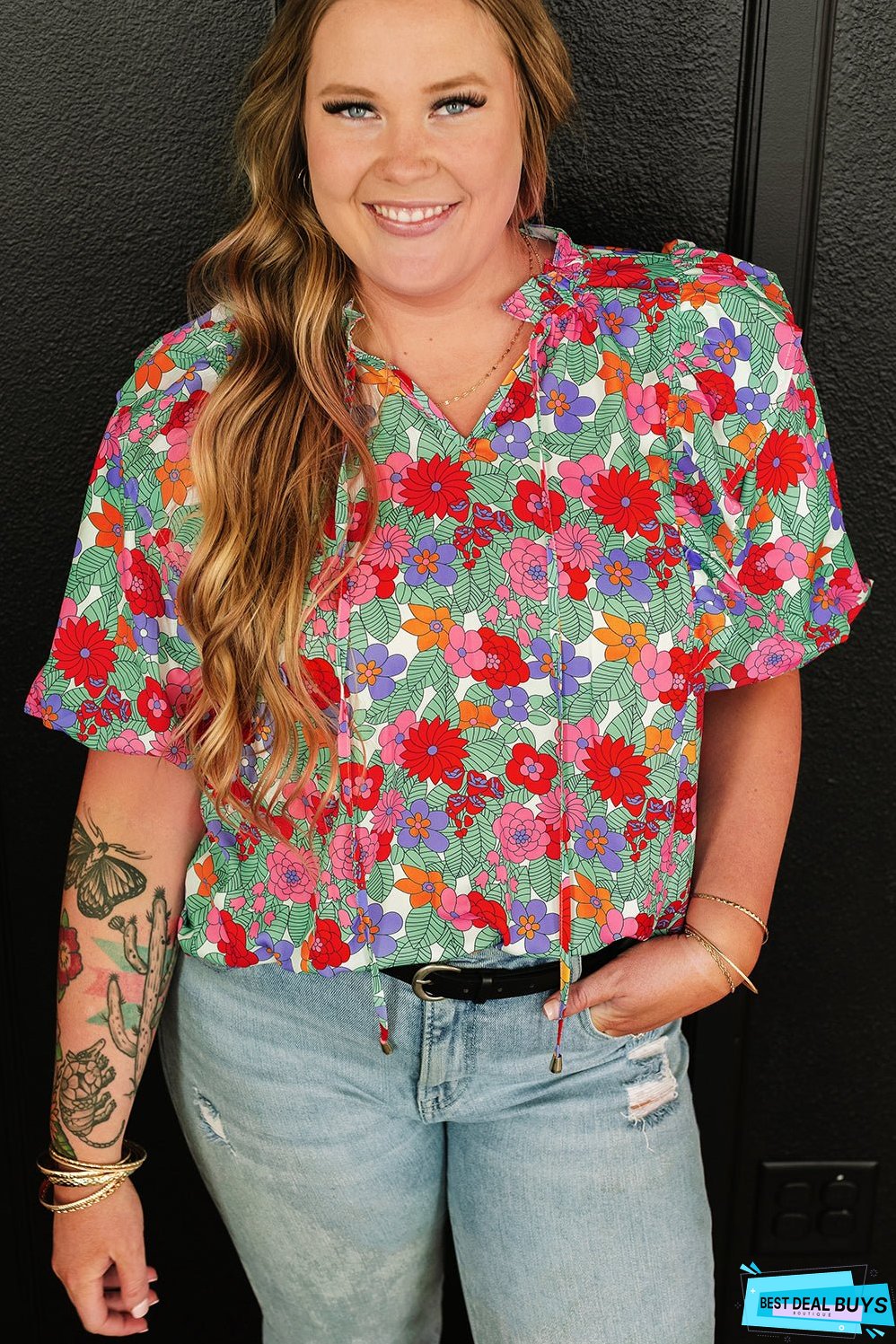 Upgrade your wardrobe with our Plus Size Floral Print Ruffle Blouse. This chic and elegant design is perfect for any occasion, from casual to office to special events. The bubble sleeves add a touch of beauty and the V neck enhances your neckline. Get the latest in fashion with this must-have piece. Perfect for summer, spring, weddings, parties, and prom.