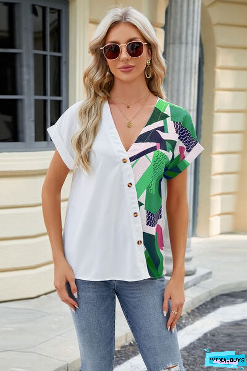 Enhance your wardrobe with our Printed Surplice Short Sleeve Blouse. Its unique design features a surplice neckline and short sleeves. perfect for a casual yet chic look. The printed pattern adds a touch of style to any outfit. Made with high-quality materials. this blouse is both comfortable and stylish.