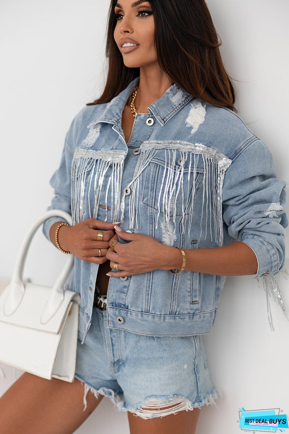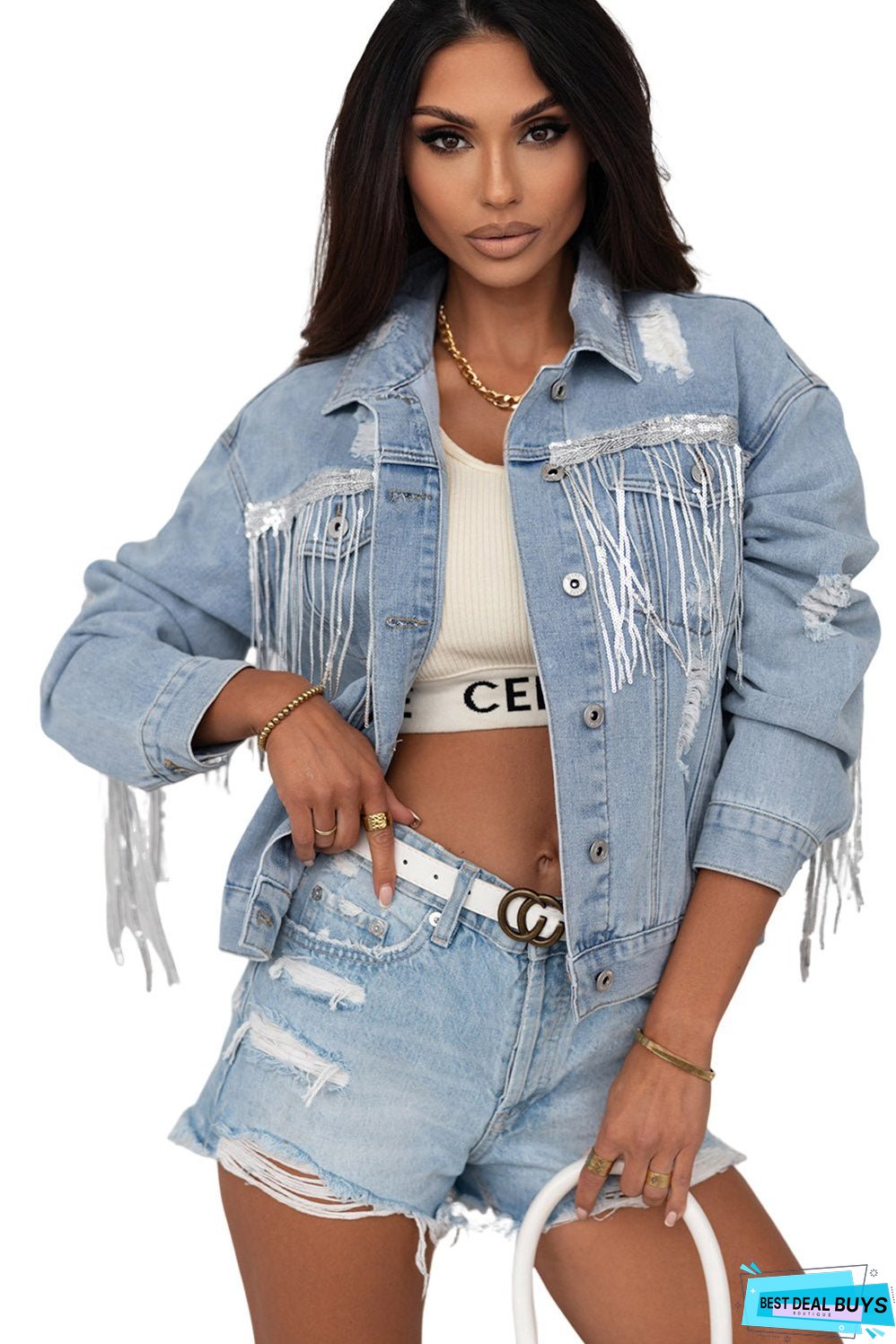 Elevate your look with this Sequin Embellished Fringe Distressed Denim Jacket. Perfect for casual wear, this jacket features pockets and buttons with added elements of fringe detailing, highlighting its fashionable distressed style. Add it to your wardrobe for a unique and stylish look.