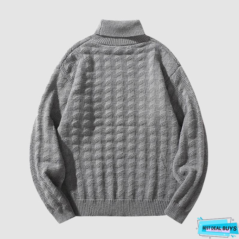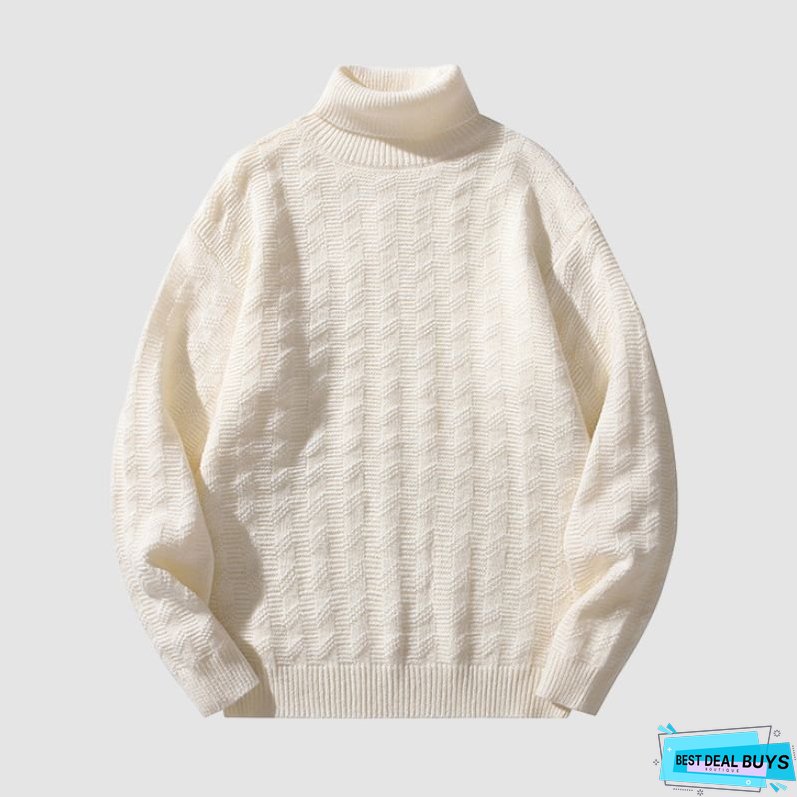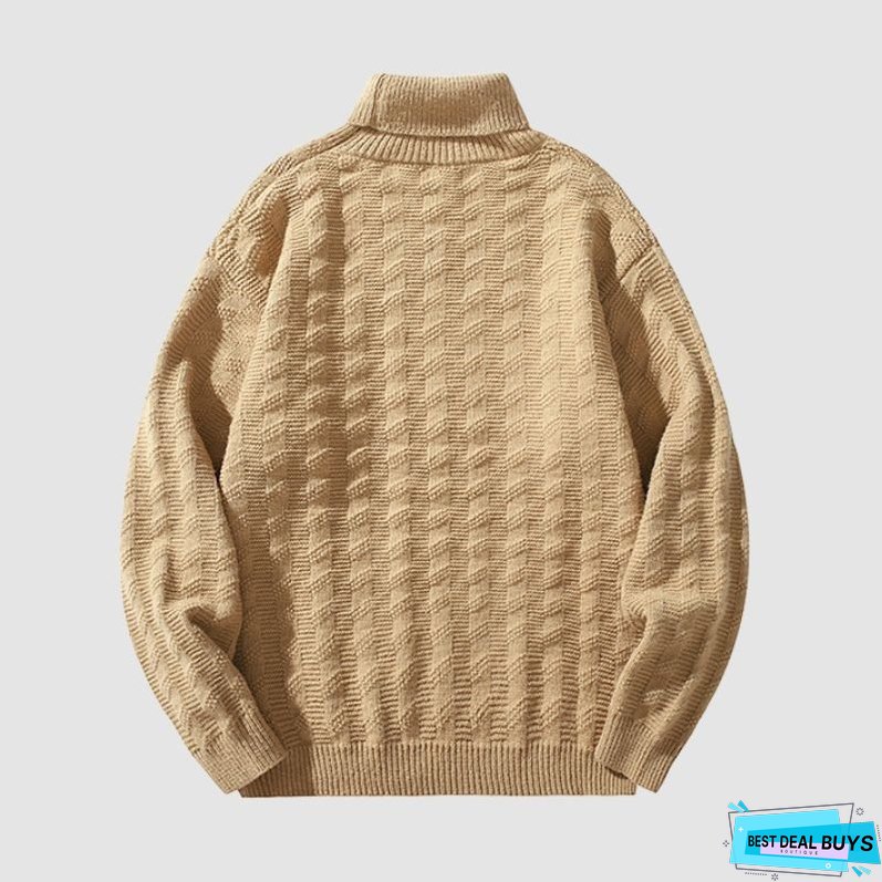 Features: Pullover. sweater. turtleneck. long sleeve. jacquard wave. solid color. knit. relaxed fit. couple outfits.