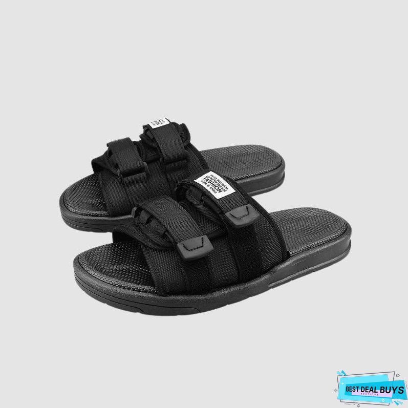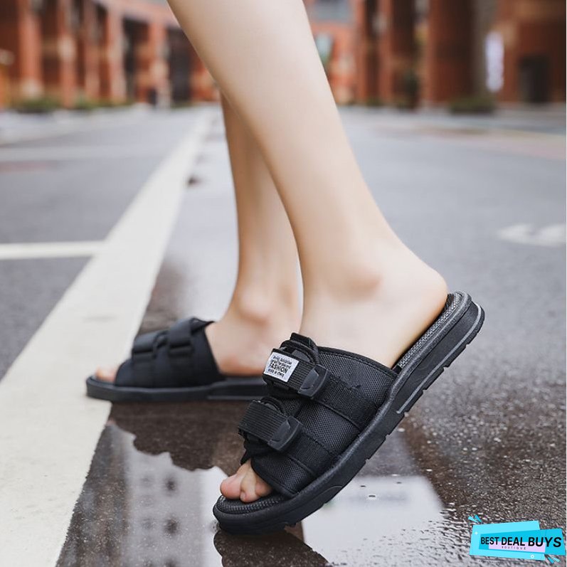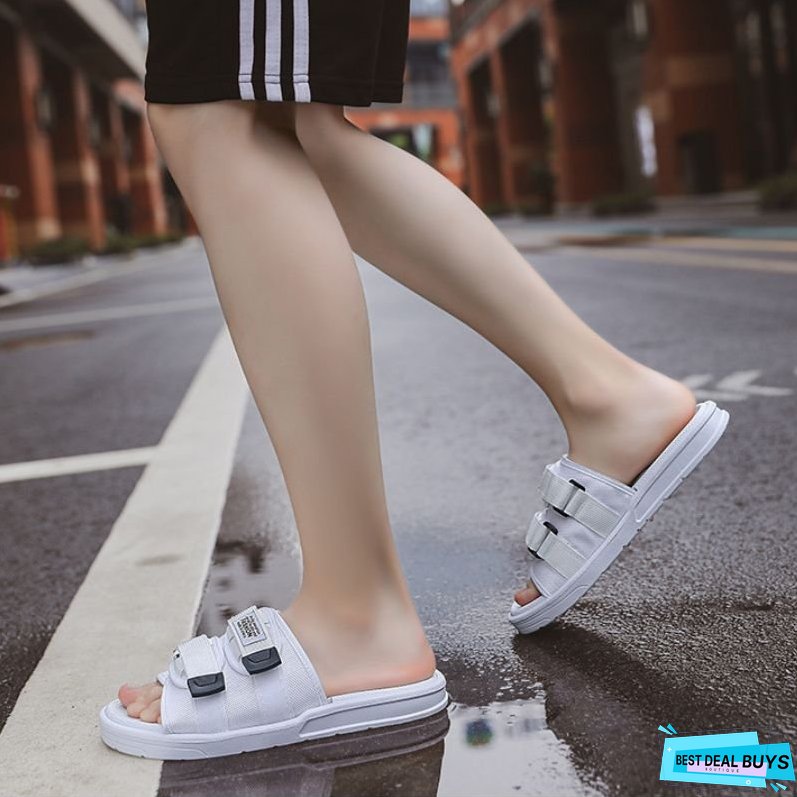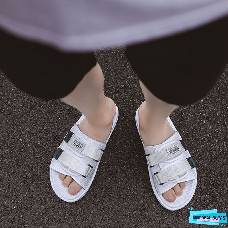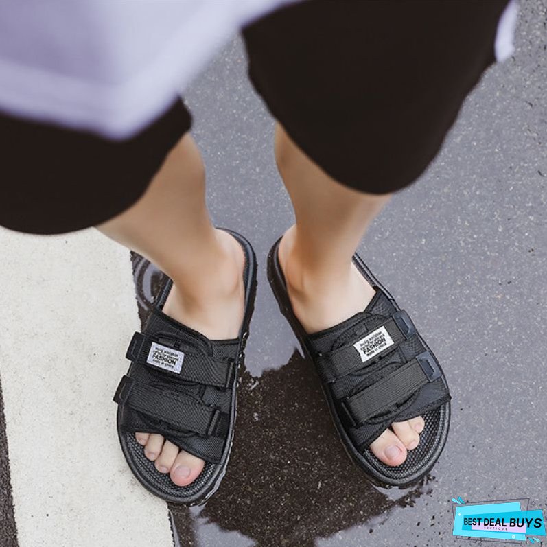 Features: Slippers. solid color. platform. velcro decor. slip-on. unisex.