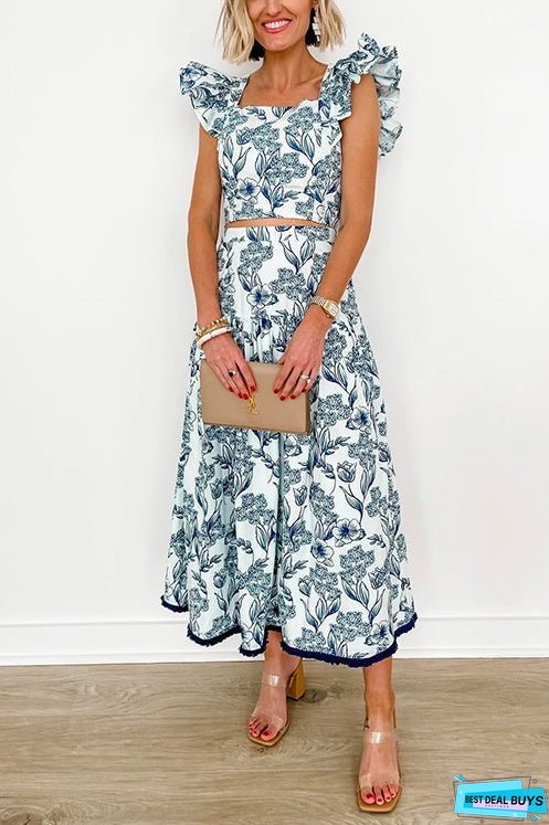 Introducing our Square Collar Ruffle Sleeves Crop Top and Midi Swing Skirt Printed Set - the perfect ensemble for a chic and playful look! This set features a flattering square neckline and ruffle sleeves for a touch of femininity, paired with a flowy midi skirt adorned with a colorful print. Stand out in style and confidence with this must-have set!