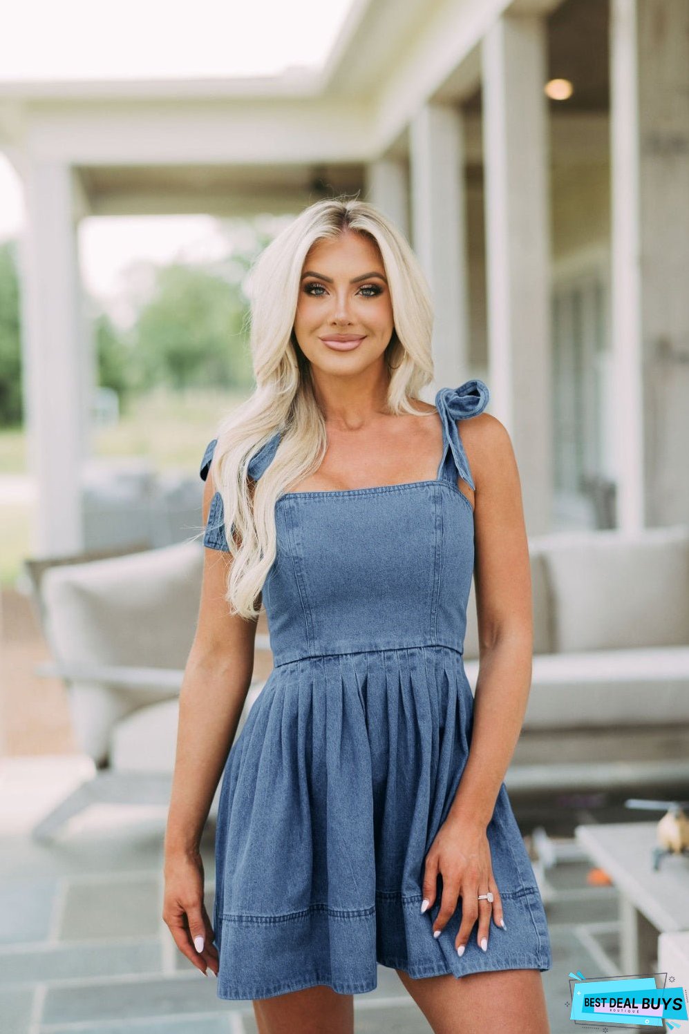 Effortlessly chic and versatile. our Square Neck Tie Shoulder Denim Dress is a must-have for any wardrobe. Made from high-quality denim material. this dress is perfect for any casual occasion. Its square neck and tie shoulder design add a touch of elegance. while the mini length gives a flattering and modern look. Elevate your style with this comfortable and stylish dress.