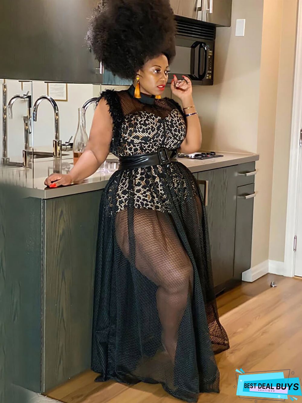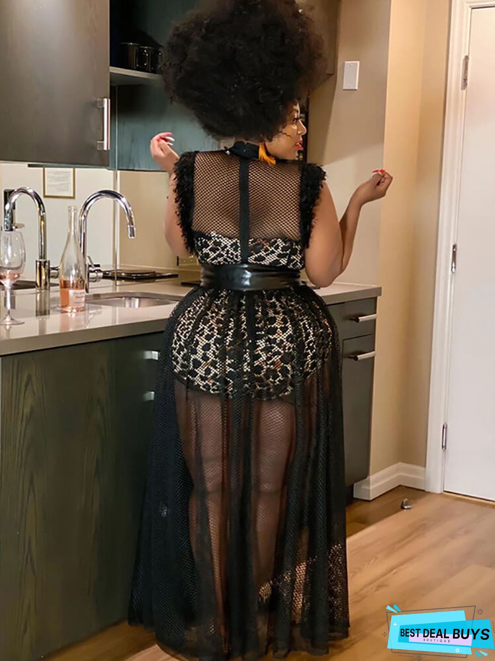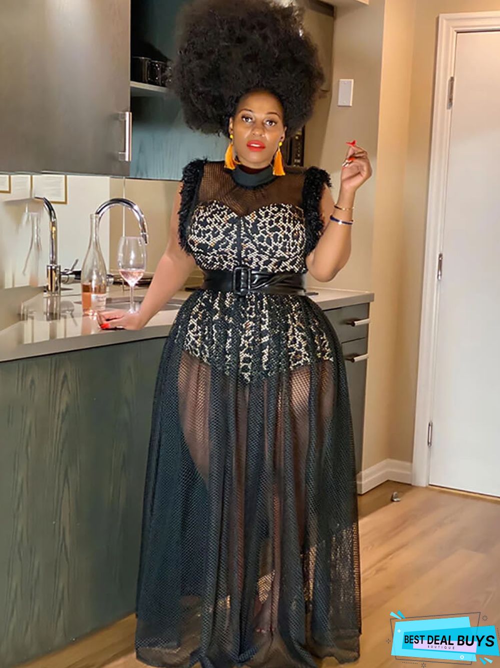 Feature: Mesh, floral print, leopard print, patchwork, tassel, sleeveless, see-through, mock neck, casual, long cover-up.