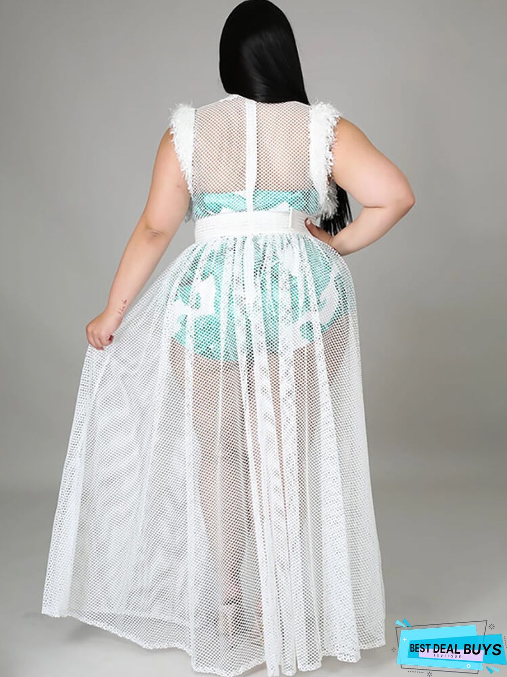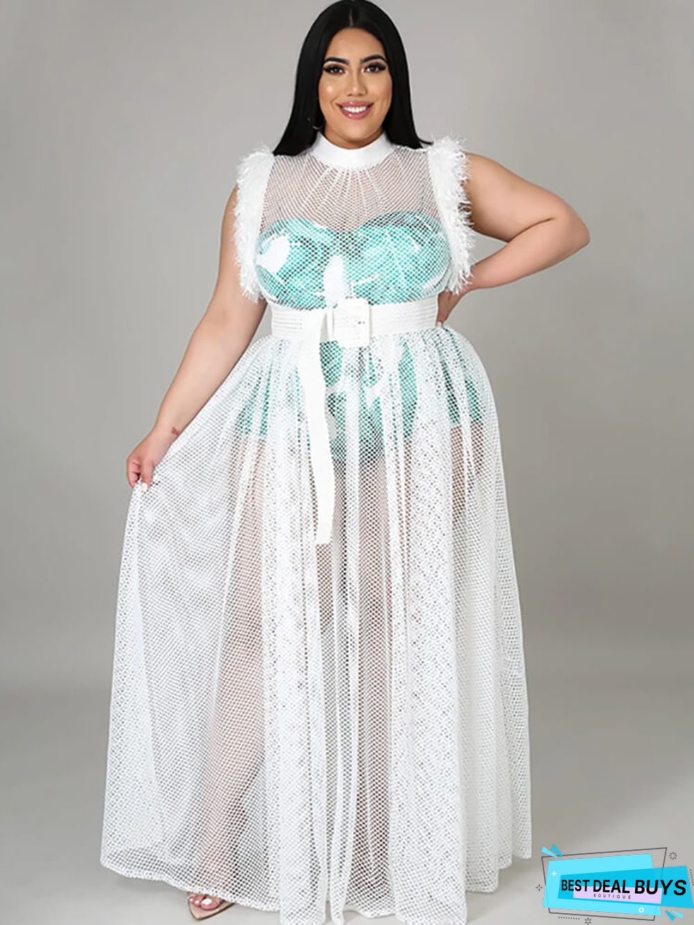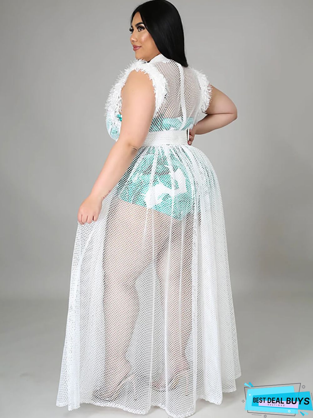 Feature: Mesh, floral print, leopard print, patchwork, tassel, sleeveless, see-through, mock neck, casual, long cover-up.