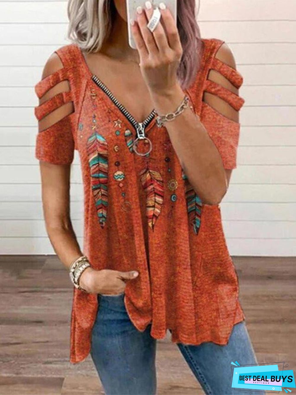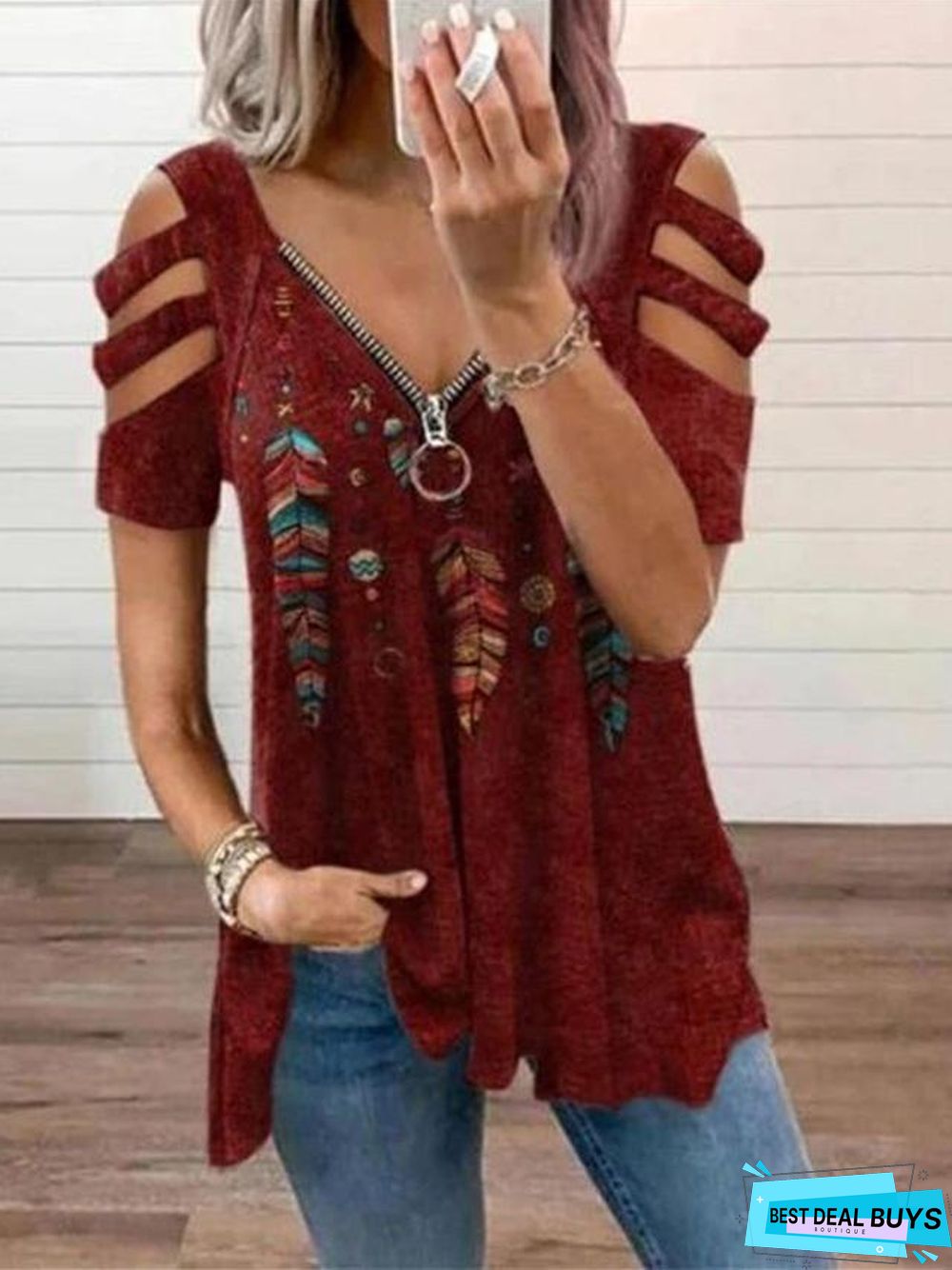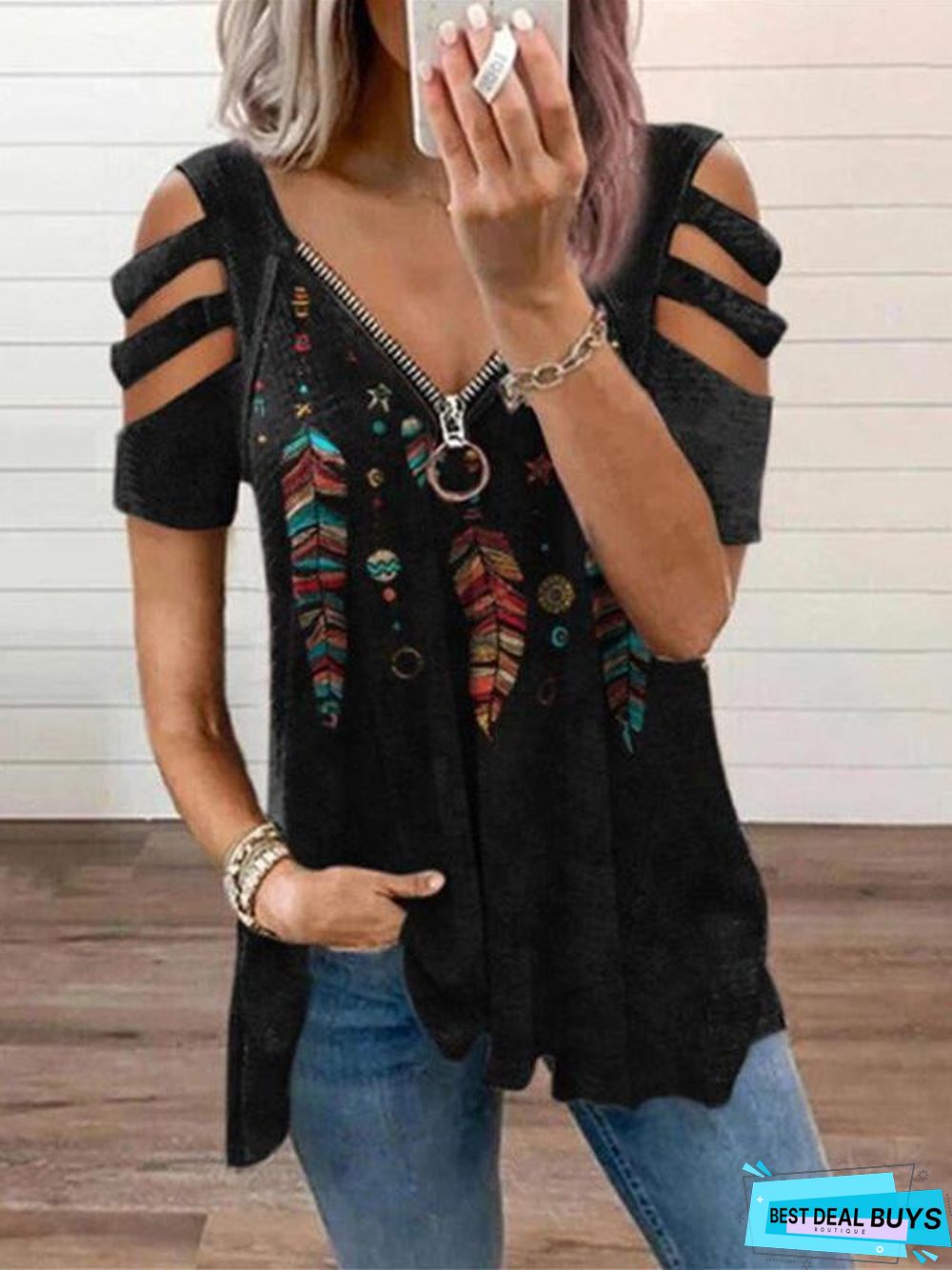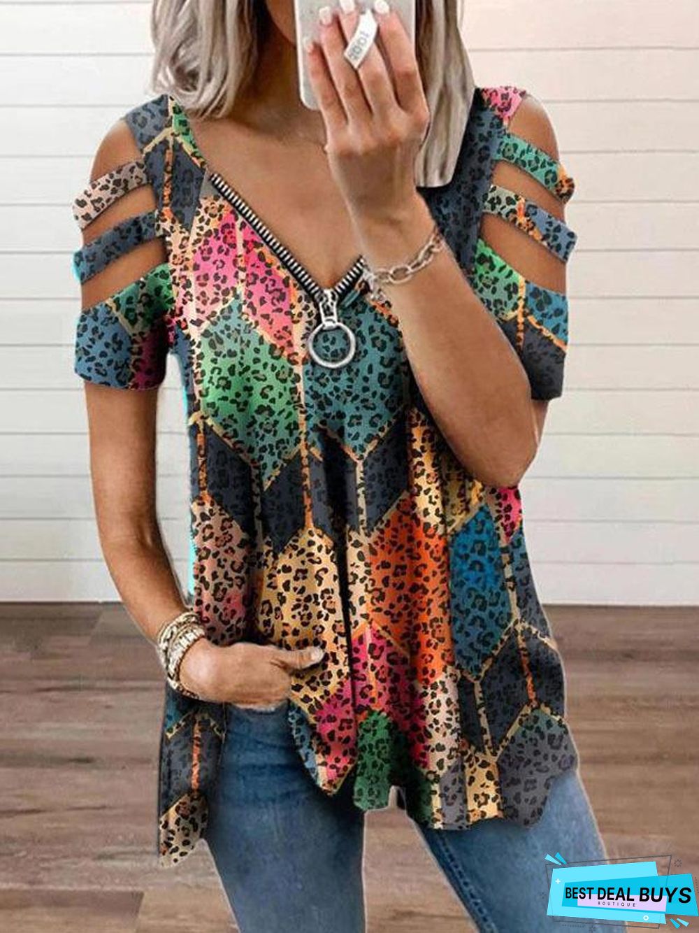 V-neck Zipper Pullover Printed Short Sleeve Loose T-shirt Women's Jacket