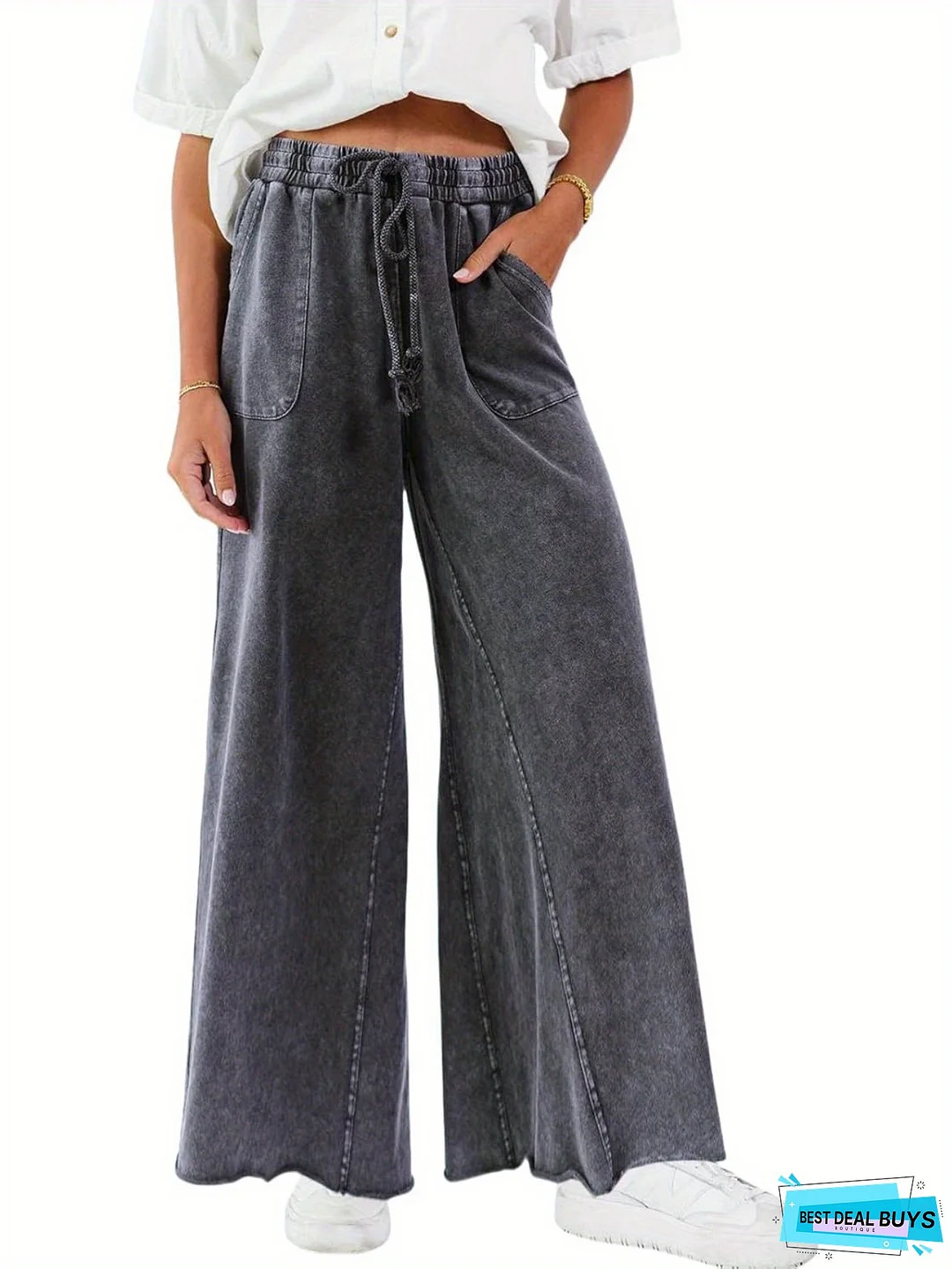 Women's Wide-legged Sweatpants Loose Unique Elastic Waist Jeans High Waist Drawstring Thin Pants with Pockets