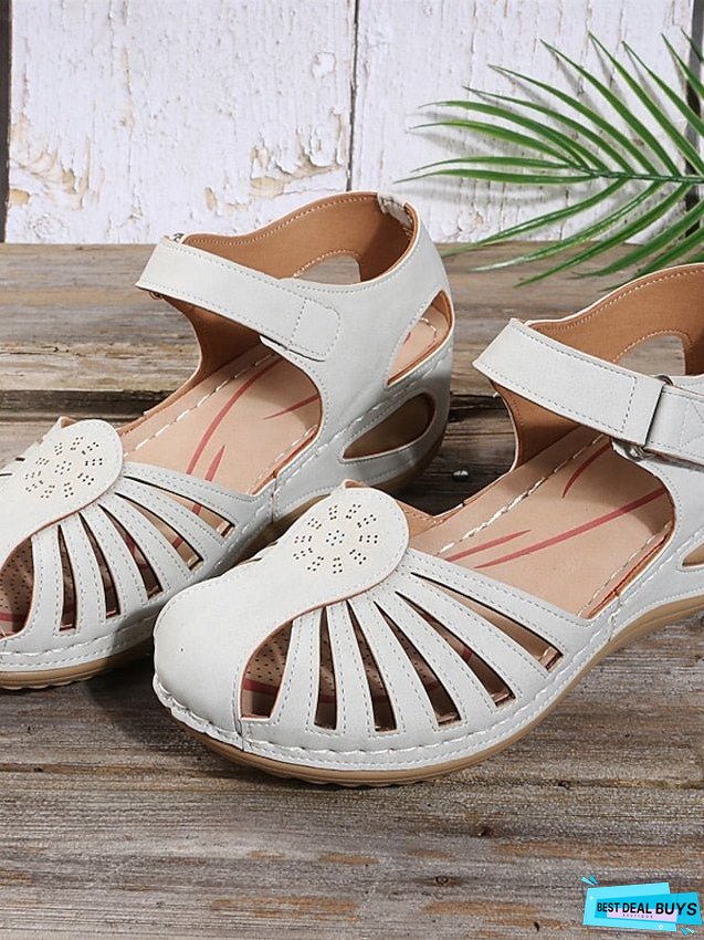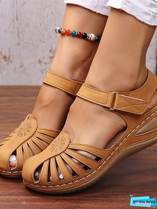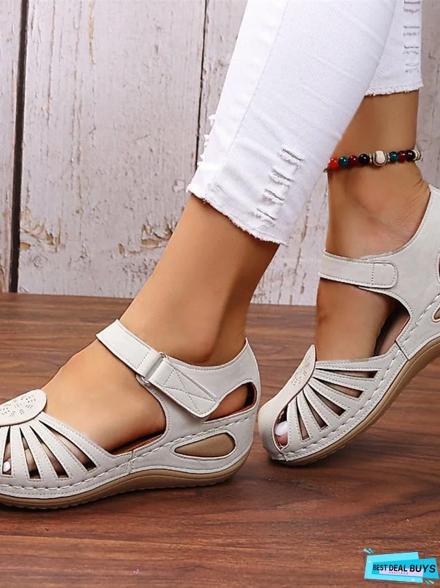 Highlights - Elevate your style with the trendy Wedge Heel design.- Enjoy comfort and stability with this well-balanced wedge heel.- Perfect for dressy occasions or casual wear, the Wedge Heel will never go out of style. Specifications Gender: Women's, Category: Sandals, Style: Minimalism, Casual, Occasion: Beach, Outdoor, Toe Shape: Round Toe, Upper Materials: Faux Leather, Outsole Materials: MD (Phylon), Heel Height(inch): 3-4, Pattern: Solid Color, Season: Summer, US Size: 36:6;37:6.5-7;38:7.5;39:8;40:8.5;41:9, UK Size: 36:4;37:4.5-5;38:5.5;39:6;40:6.5;41:7, EU Size: 36:36;37:37;38:38;39:39;40:39;41:40, Foot Length (cm): 36:22.6-23;37:23.1-23.5;38:23.6-24;39:24.1-24.5;40:24.6-25;41:25.1-25.6, Foot Width (cm): 36:8.5-9;37:9;38:9-9.5;39:9.5;40:9.5-10;41:10, Trends: Wedge Sandals, Plus Size, Closure Type: Buckle, Details: Cut Out, Heel Type: Wedge Heel, Platform, Photos Size Chart ID: 179956Provided by Supplier.Please Note: Listed size charts may vary according to different Size Chart IDs. Inches Centimeters Size US Size UK Size EU Size Foot Length Foot Width 36 6 4 36 22.6-23 8.5-9 37 6.5-7 4.5-5 37 23.1-23.5 9 38 7.5 5.5 38 23.6-24 9-9.5 39 8 6 39 24.1-24.5 9.5 40 8.5 6.5 39 24.6-25 9.5-10 41 9 7 40 25.1-25.6 10 How to Measure Introductions: When Measuring your feet please remember to wear the socks/hosiery you would normally wear for this type of footwear.Step1:Prepare a blank paperStep2:Place your foot on the blank paperStep3:Mark the end of your heel and the tip of your longest toeStep4:Measure the length with a ruler and find out the size at below chart Note: Please read How-to-Measure section very carefully before using our size chart. According to the foot length to chose your shoes.In addition, note that the size chart may vary from product to product with different size chart IDs.