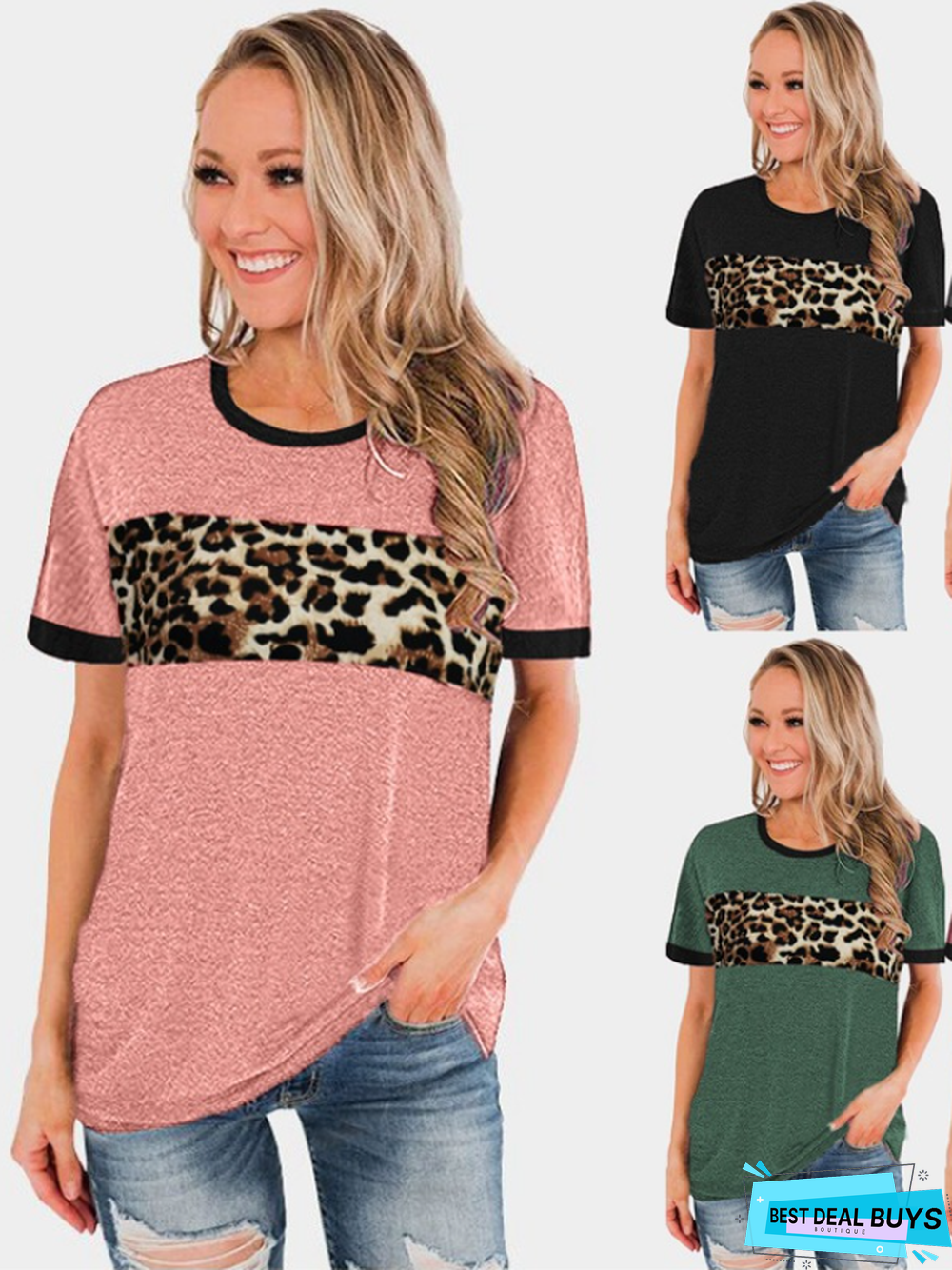 Women's Spring and Summer New Round Neck Leopard Pattern Splicing Short Sleeve T-Shirt