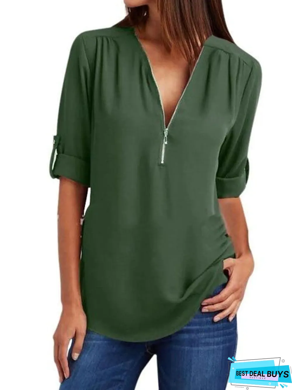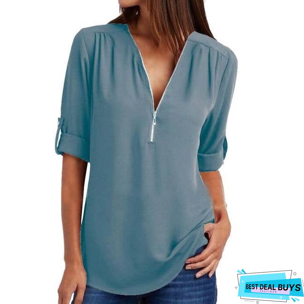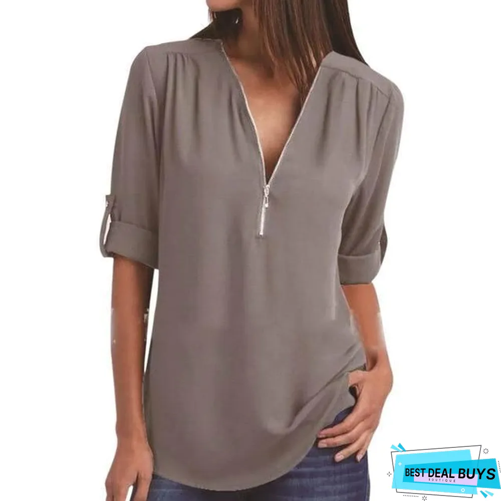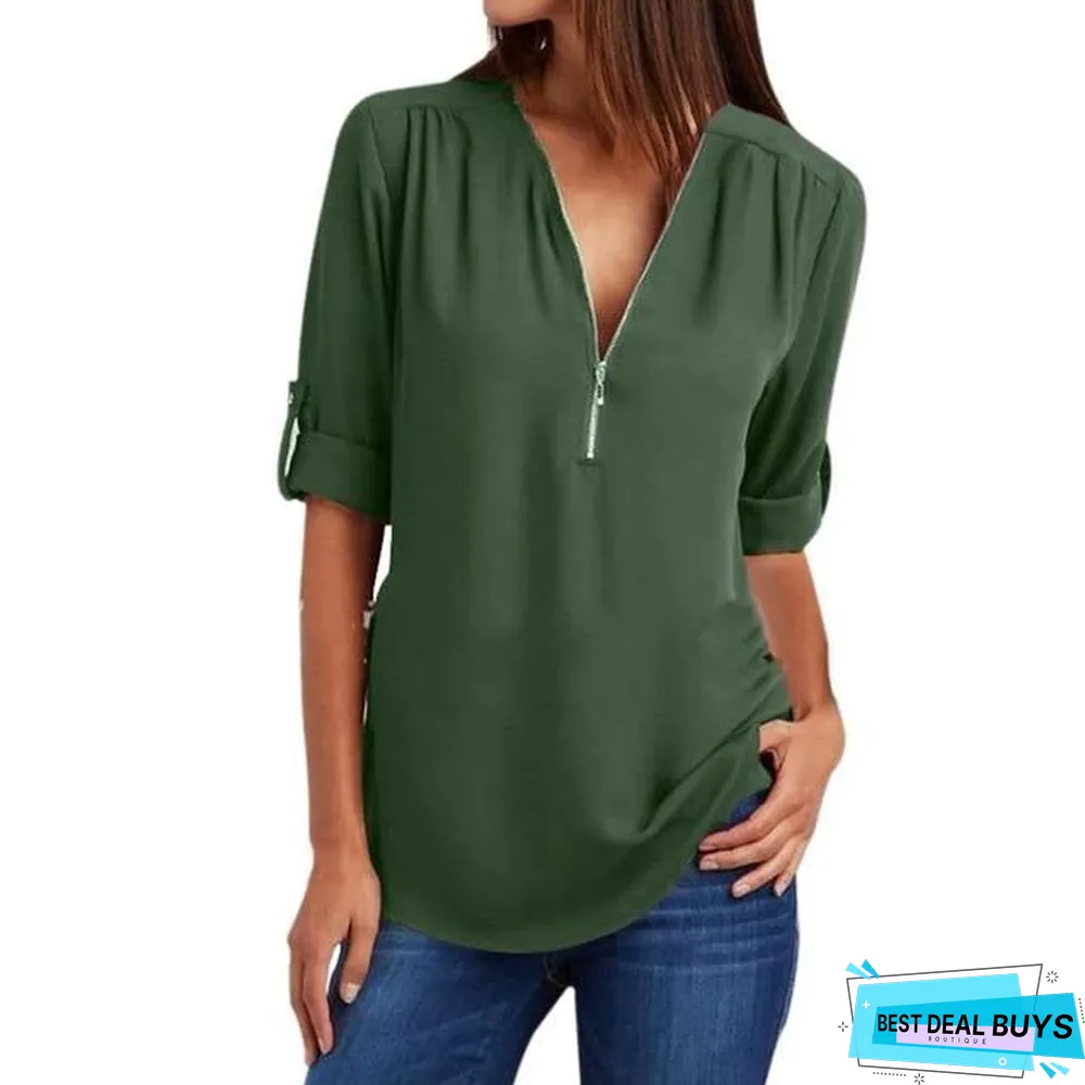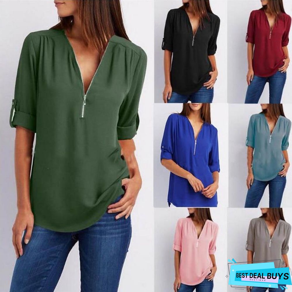 zipper casual long sleeve shirts: solid buttons basic tops
